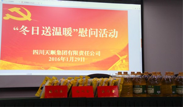春節將至,歲寒情深。2016年1月29日上午,四川天順集團有限責任公司在公司會議室開展了“冬日送溫暖”慰問活動,為張鑫等12名困難黨員、員工分別送上價值350元的大米、食用油和500元慰問金,在這個寒...