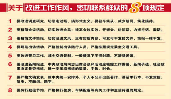 2012年12月4日,中共中央政治局召開會議,審議并通過了中央政治局關于改進工作作風、密切聯(lián)系群眾的八項規(guī)定。會議強調(diào),抓作風建設,首先要從中央政治局做起,要求別人做到的自己要先做到,要求別人不做的自...
